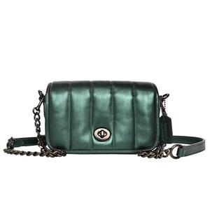 [平輸版] 【COACH】Dinky 18金龜綠絎縫小香風直紋全皮旋釦翻蓋斜背包/隨身包/手機包/晚宴包 (迷你) 真品平輸