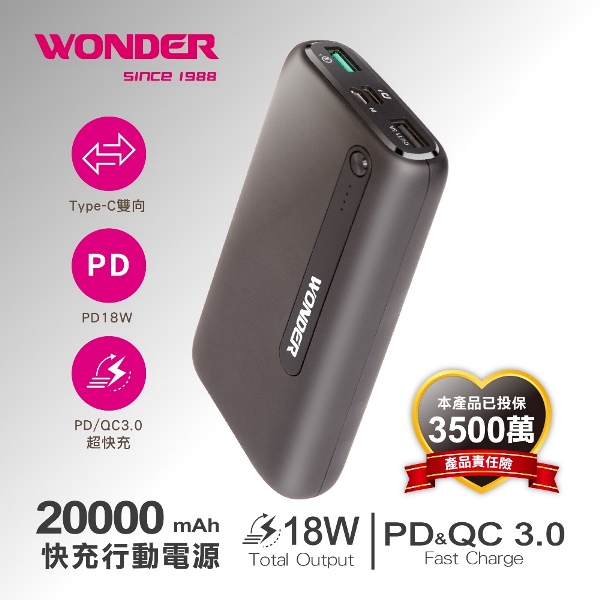 【WONDER】 旺德 多功能旅行插頭帶線快充行動電源 (20000mAH) 黑 WA-P15BA【交換禮物必備好物】