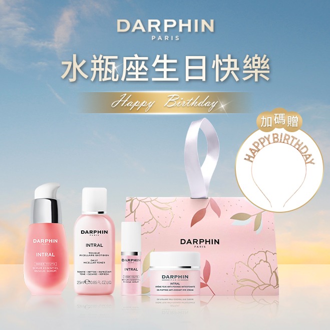 水瓶座生日快樂💓送女友生日禮物 送禮【DARPHIN 朵法】法式水漾美妍保濕保養組| (NEW)活水保濕凝膠5ml+全效舒緩精華5ml花梨木卸妝膏5ml+Happy Birthday水鑽髮箍+提袋