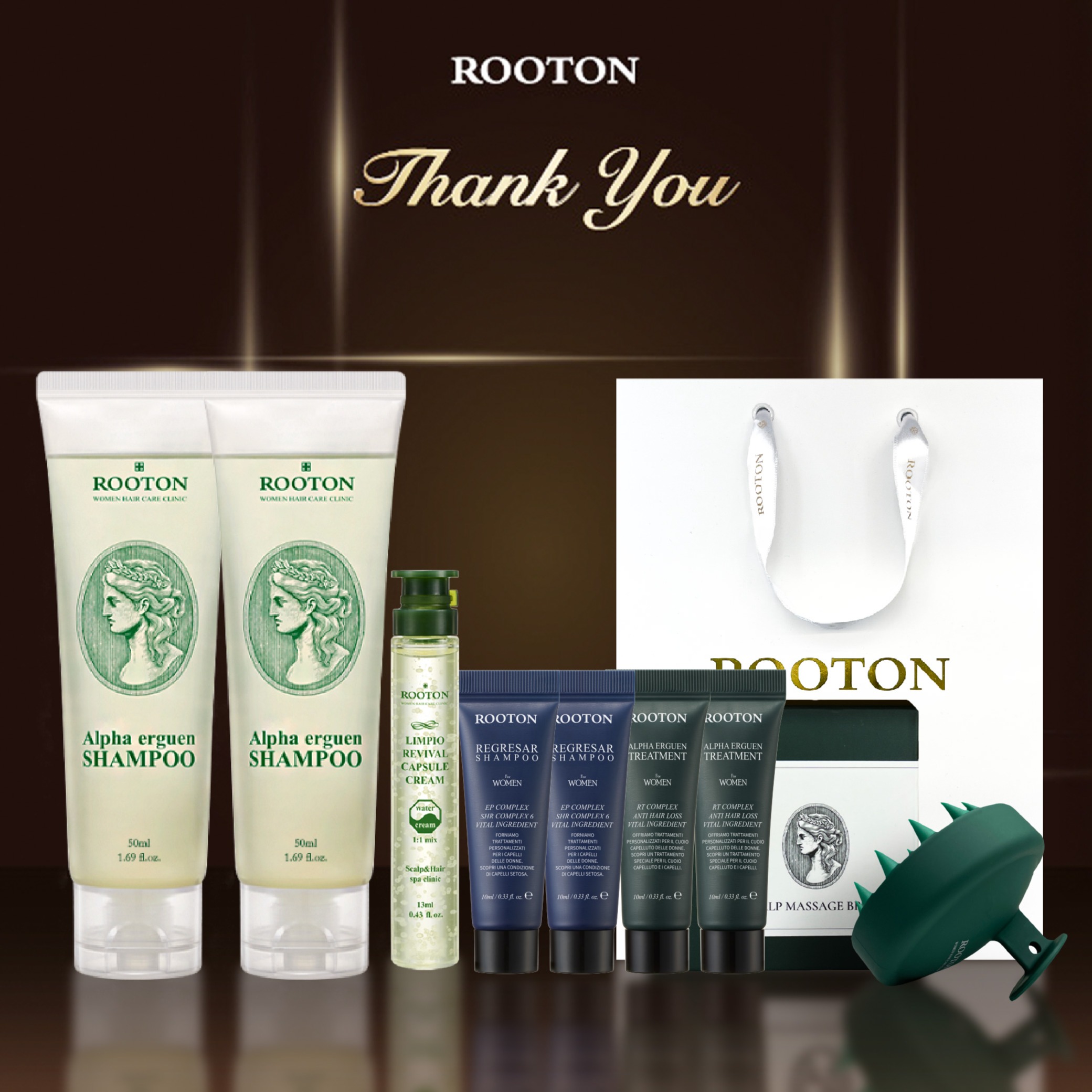 快速出貨【ROOTON】生日快樂!甦活植萃洗髮精50ml x2+奇蹟復甦精萃綠瓶13ml+頭皮按摩梳+海藻洗髮精10ml x2+護髮素10ml x2+品牌質感提袋(射手座生日禮物)