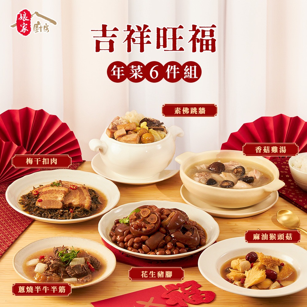[過年|年菜]【貞榮小館】2026貞榮雅聚年菜組(冬菇雞腿黃金湯+大吉大栗花膠肉+刈包+迎春醬燒無錫排+傳香櫻花蝦米糕+牛轉墘坤半筋肉+私房御品花雕雞)
