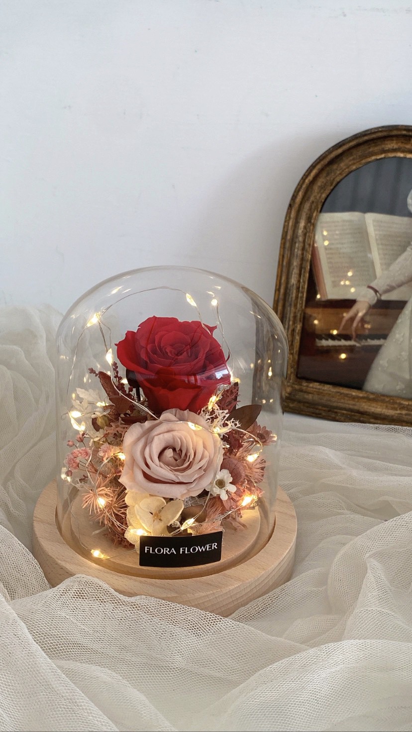 情人節首選【Flora Flower】輕巧玻璃永生花束夜燈- 胭脂粉 乾燥花 永生花 生日 情人節 蛋糕 禮物