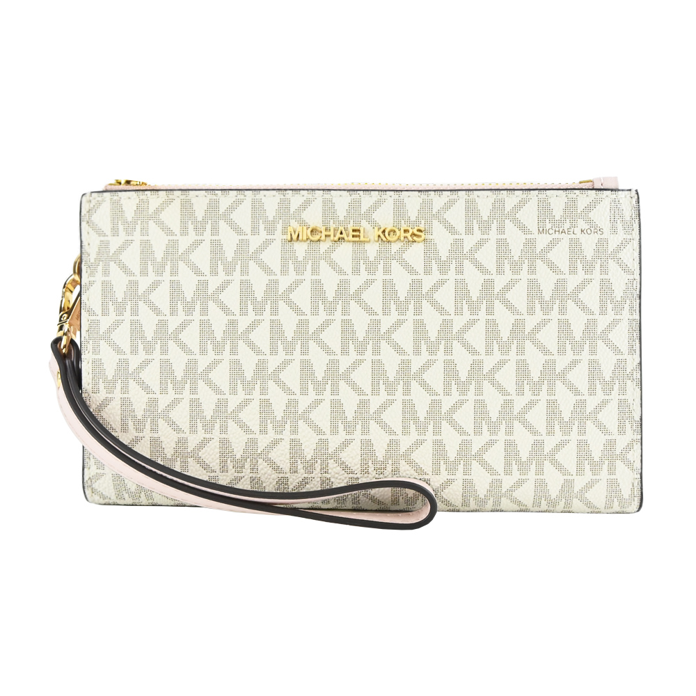 [平輸版] 【COACH】 仿刺繡櫻桃皮雕亮粉燙印白堊色皮革手掛拉鍊長夾 真品平輸