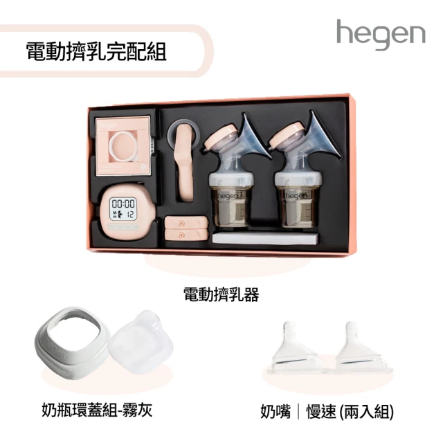 【hegen】 電動擠乳完配組 - (電動擠乳器+奶嘴慢速 (兩入組)+環蓋組-霧灰)/奶瓶/兒童水瓶/母嬰用品/兒童水杯/新生禮/月子中心/蒸汽消毒/紫外線消毒/沸水消毒/FDA食品接觸認證/學習
