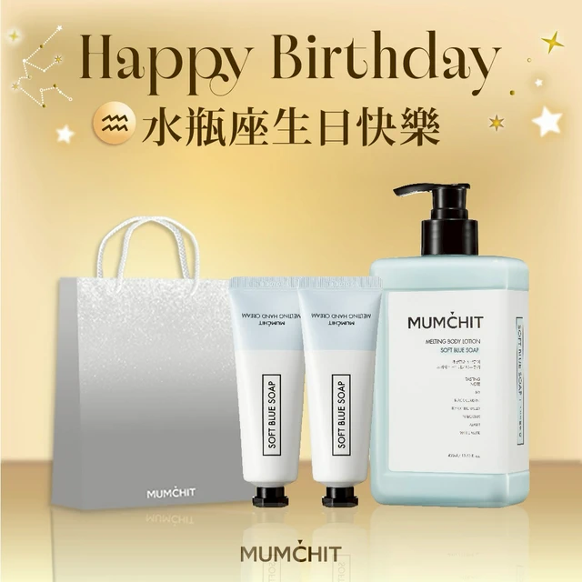 快速出貨【MUMĆHIT】水瓶座生日快樂!天然香氛沐浴乳+香氛護手霜2入+霧銀禮袋(生日禮物)(水瓶座禮物)