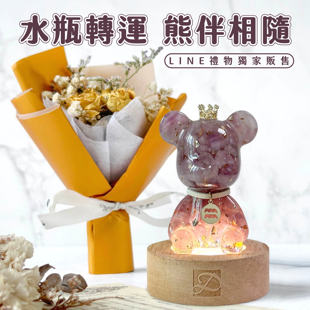 [快速出貨]【彤恩時尚】水瓶座生日快樂㊗️紫粉晶水晶熊燈座組『LINE禮物獨家』 | 生日禮物 情人節禮物