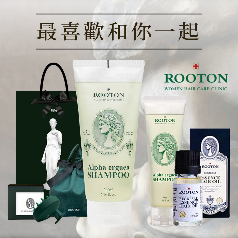 快速出貨【ROOTON】情人節快樂!髮根噴霧150ml+甦活植萃洗髮精200ml+沐浴膠5ml+身體乳5ml+甦活養髮梳+棉麻束口袋+情人節小卡+燙金禮袋