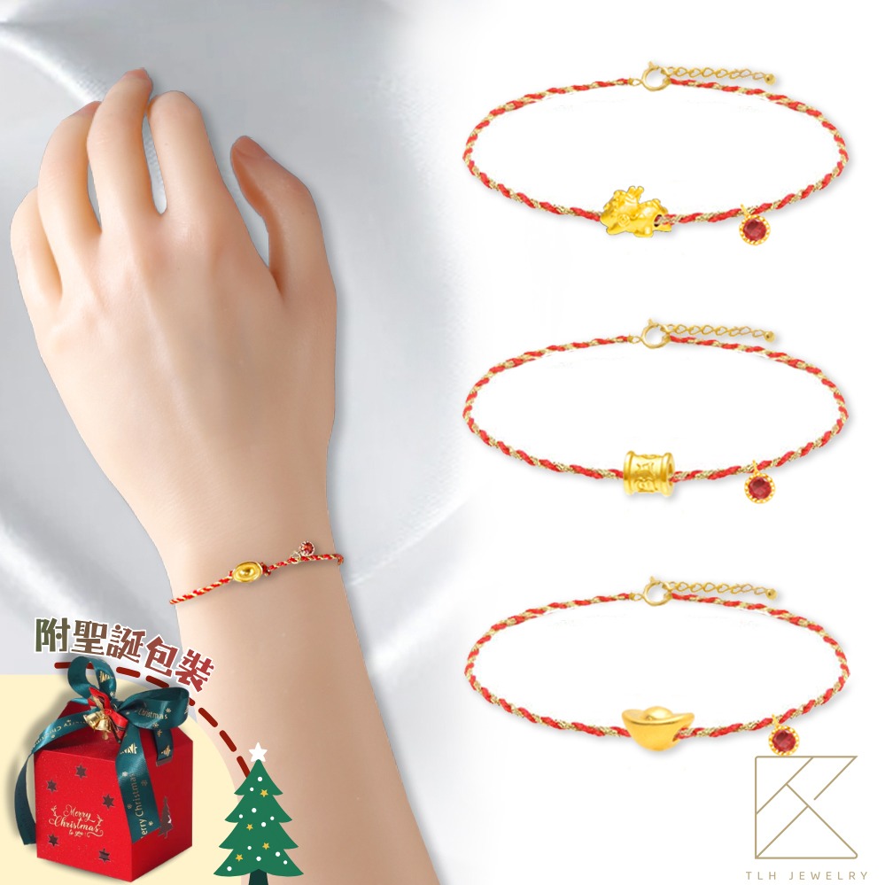 【快速出貨】【TLH】聖誕節禮物 黃金墜編織手鍊 純金999 多選 招財貓幸運紅繩×誕生石 約重0.02錢±0.01