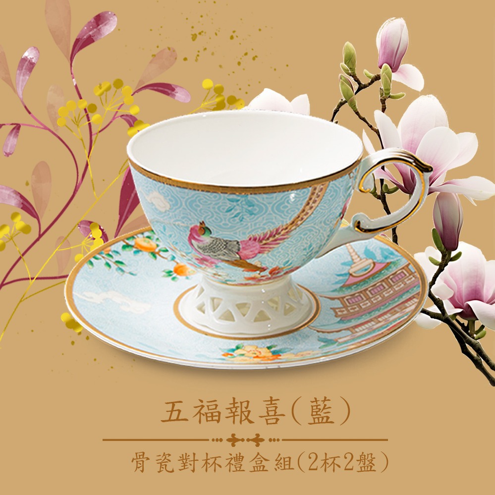一杯子一輩子【A&L】骨瓷對杯禮盒組-杏花春雨(2杯2盤_緞帶禮盒包裝)