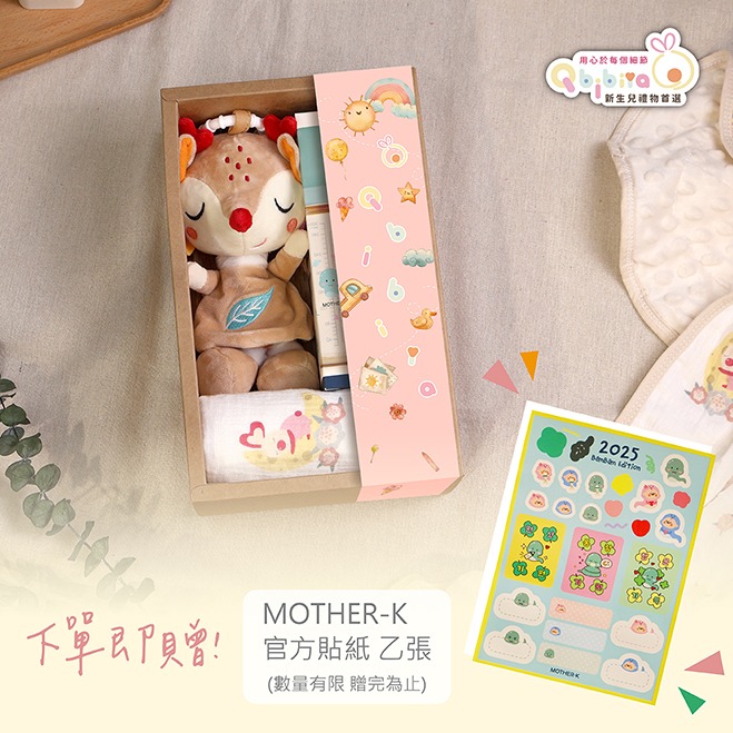 🎁客製刺繡【Qbibiya新生兒禮物】祝福系列-蘑力無窮-安撫娃娃+紗布萬用巾+啃咬圍兜+奶嘴娃娃+寶寶止滑襪(蛇年彌月禮盒滿月禮盒)