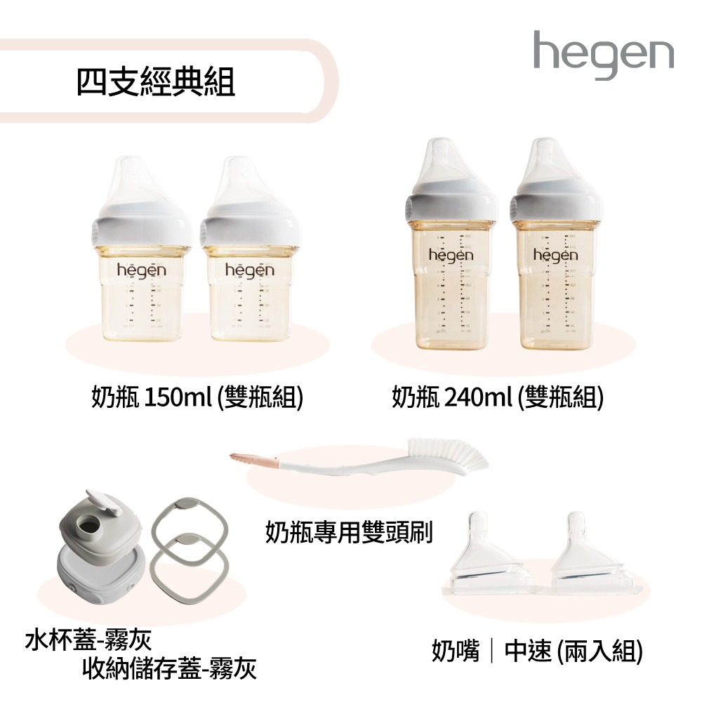 【hegen】 150ml奶瓶必備組 - (寬口奶瓶 150ml (雙瓶組)+儲存蓋-霧灰)/母嬰用品/新生禮/月子中心/月嫂/蒸汽消毒 /紫外線消毒 /沸水消毒/FDA食品接觸認證/不含塑化劑/不