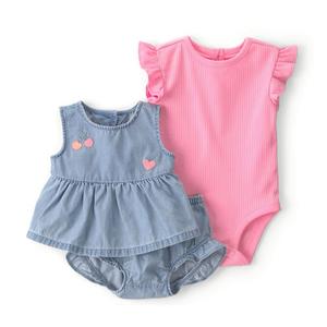 【Carter’s】櫻桃粉牛仔 3件組套裝(上衣/包屁衣/尿布褲) | 官方授權 包屁衣 三件組 週歲生日禮首選