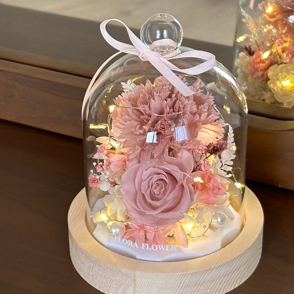 情人節首選【Flora Flower】輕巧玻璃永生花束夜燈-淡粉 乾燥花 永生花 生日 情人節 蛋糕 禮物