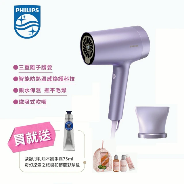 送歐舒丹紓壓枕巾香氛噴霧+ 隨身瓶 【Philips飛利浦】BLDC高速負離子護髮吹風機 (BHD837/11)