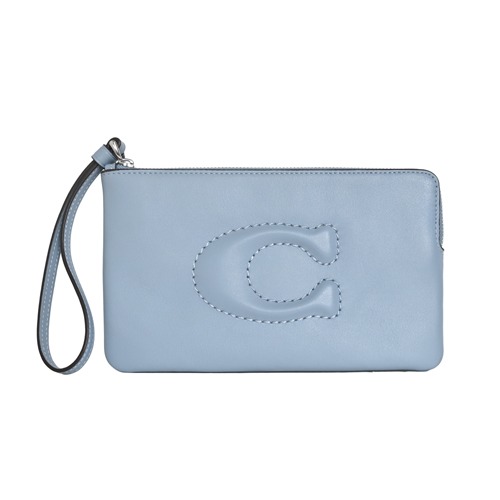 [平輸版] 【COACH】金屬珠光銀色C Logo PVC 拼接防刮皮前卡夾鑰匙零錢包 真品平輸