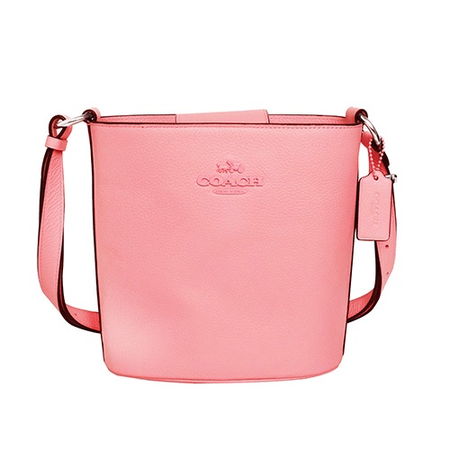 [平輸版] 【COACH】康乃馨粉衍縫布面拼接芭蕾粉真皮銀字飾牌斜背相機包 真品平輸