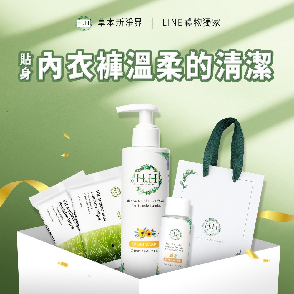 揪好姊妹一起【HH草本新淨界】LINE禮物獨家 - 女性私密衣物抗菌手洗精200mlx3入+私密濕式衛生紙x5包+品牌訂製厚磅紙袋 私密處保養 呵護 換季悶癢 經期異味 閨蜜 女友