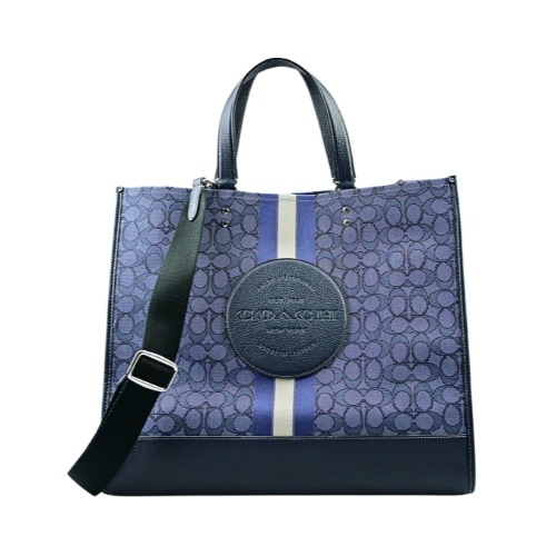 [平輸版] 【COACH】丹寧藍/月光藍C Logo PVC條紋印花肩背托特包 真品平輸