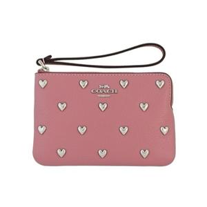 [平輸版] 【COACH】銀色愛心鉚釘牡丹粉荔枝紋全皮拉鍊萬用手拿包 真品平輸