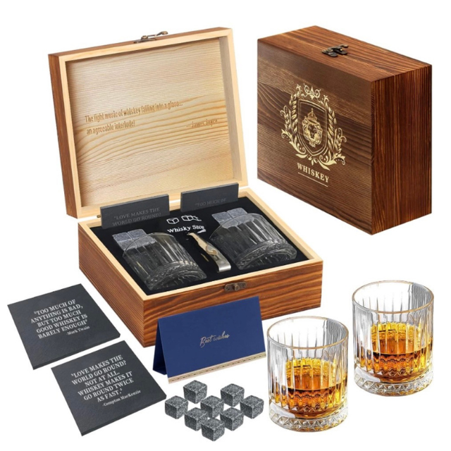 威士忌4合一精緻質感木盒禮盒 (威士忌玻璃杯 2 件組 波本威士忌杯 |6顆花崗岩冰涼岩 |花崗岩收納盤 |夾子) 最佳喬遷之禮 交換禮物 最佳禮品 最佳飲酒禮品