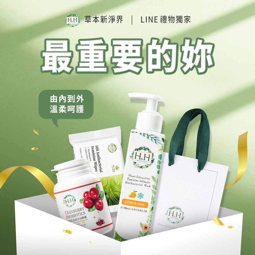 水瓶座生日快樂【HH草本新淨界】LINE禮物獨家 - 私密植萃抗菌潔淨露200ml+舒緩噴霧50ml+衣物抗菌手洗精200ml+私密濕式衛生紙x5包+品牌訂製厚磅紙袋 私密處保養 經期異味 送禮