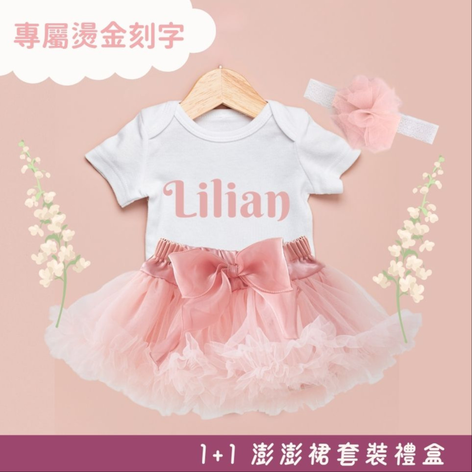 💕專屬刻字👶超夢幻寶貝禮【 1+1 澎澎裙套裝禮盒】燙金包屁衣+小雲朵經典款澎澎裙+花朵頭飾-甜甜粉橘🍊0-6Y 新生兒彌月禮