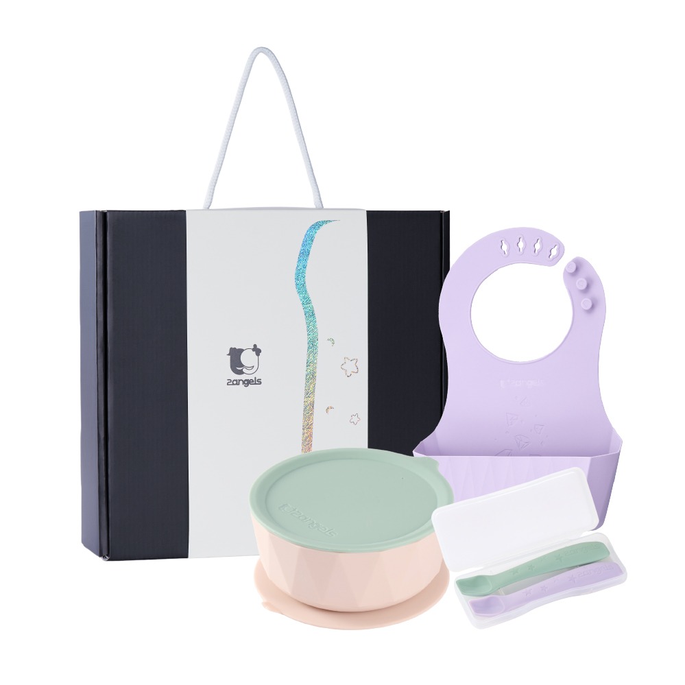 2angels矽膠學習餐具 新生彌月禮盒 [夏葉圍兜+夏葉學習碗+湯匙兩入附外出盒](學齡前孩童副食品圍兜 幼兒寶寶輕便防漏)