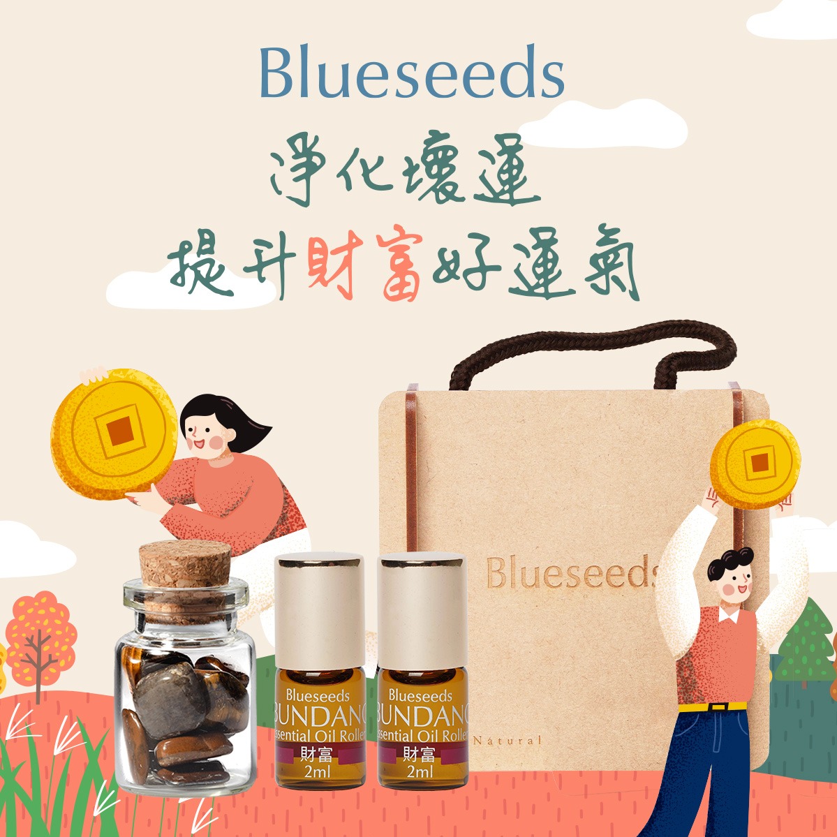【Blueseeds】1+1 提升運勢 l 守財又招財💰 l 禮物獨家贈財富滾珠2ml+派盒+束口袋【收禮者可自選護手霜】任選精油護手霜30ml+5入組單方精油滾珠 l 芙彤園