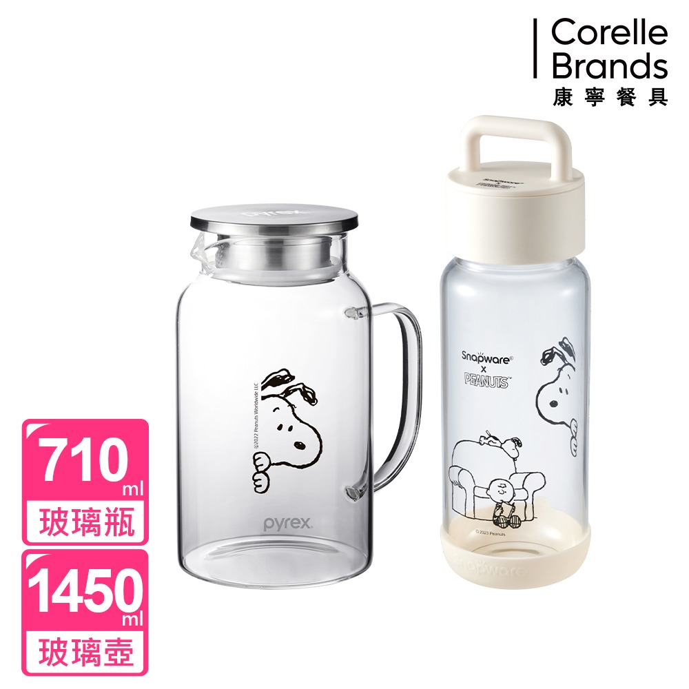 (買一送一)【美國康寧 Pyrex】SNOOPY 史努比黑白復刻耐熱玻璃壺1450ML+玻璃杯710ml