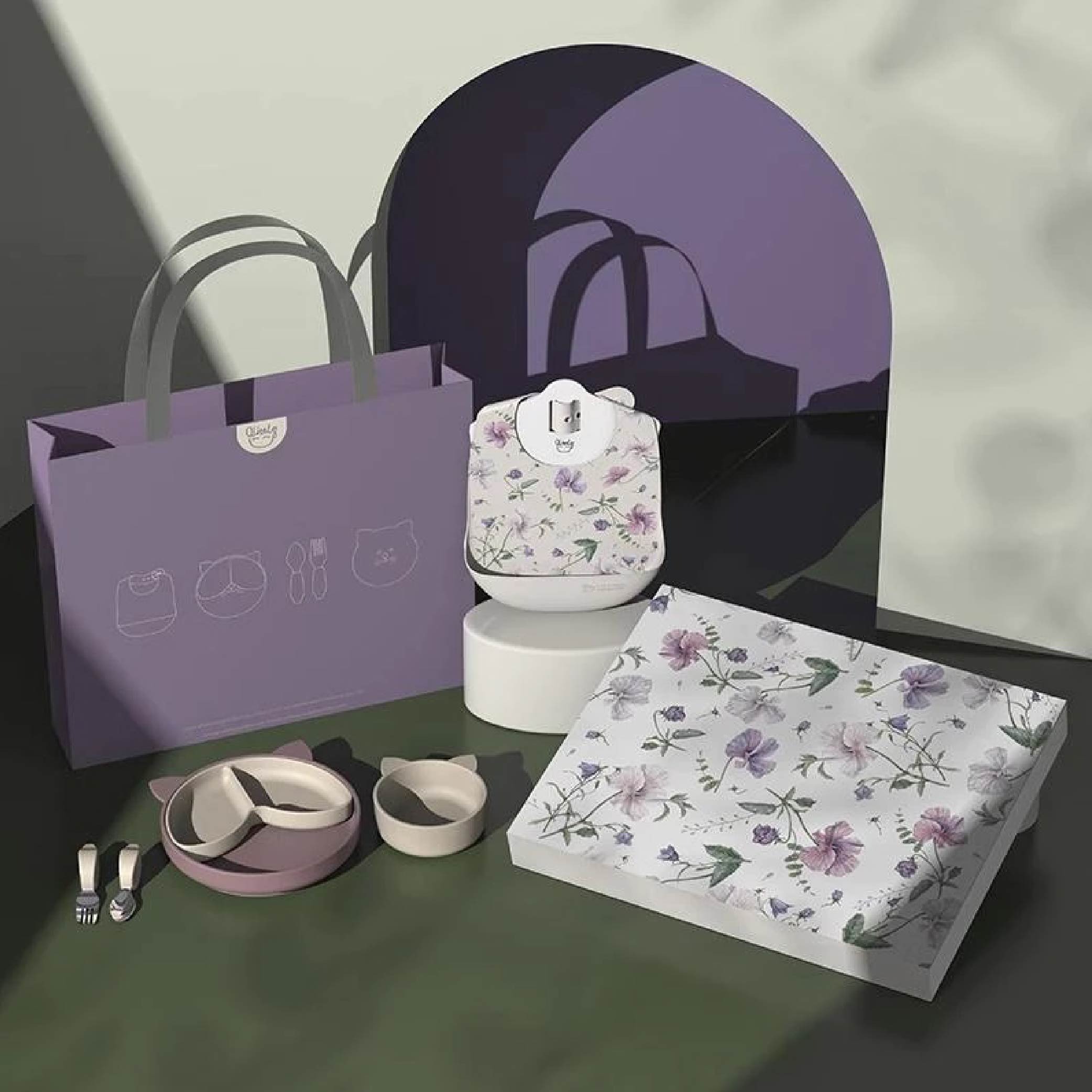 【安琪兒婦嬰百貨】Qlittle 貓咪造型餐盤組+碗+叉匙組(綠灰)