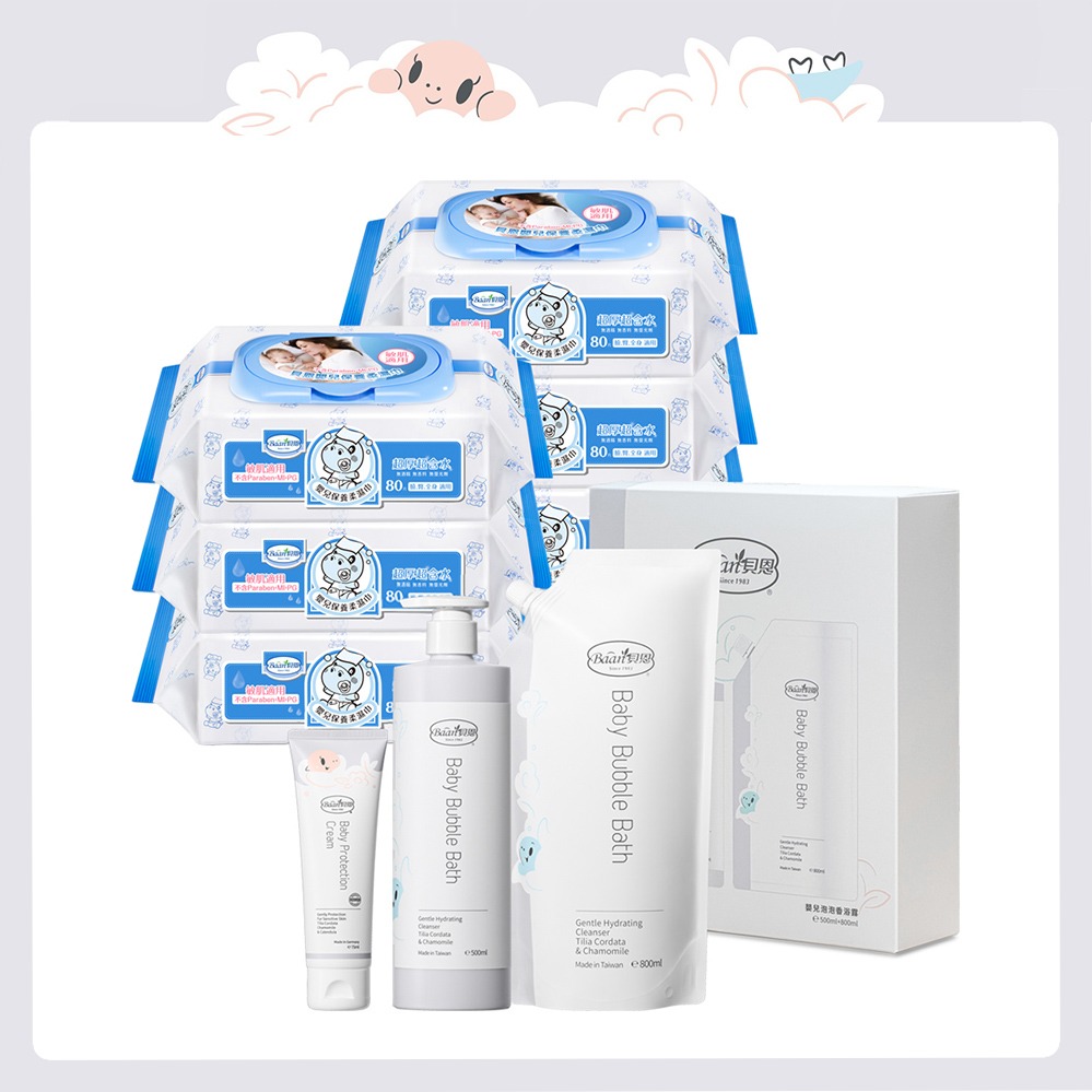 【Baan 貝恩】 熱銷育兒箱購(嬰兒泡泡香浴露500ml+保養柔濕巾80抽x20包)|新生禮、彌月禮、閨蜜送禮、寶寶新生兒禮、滿月禮、新生禮