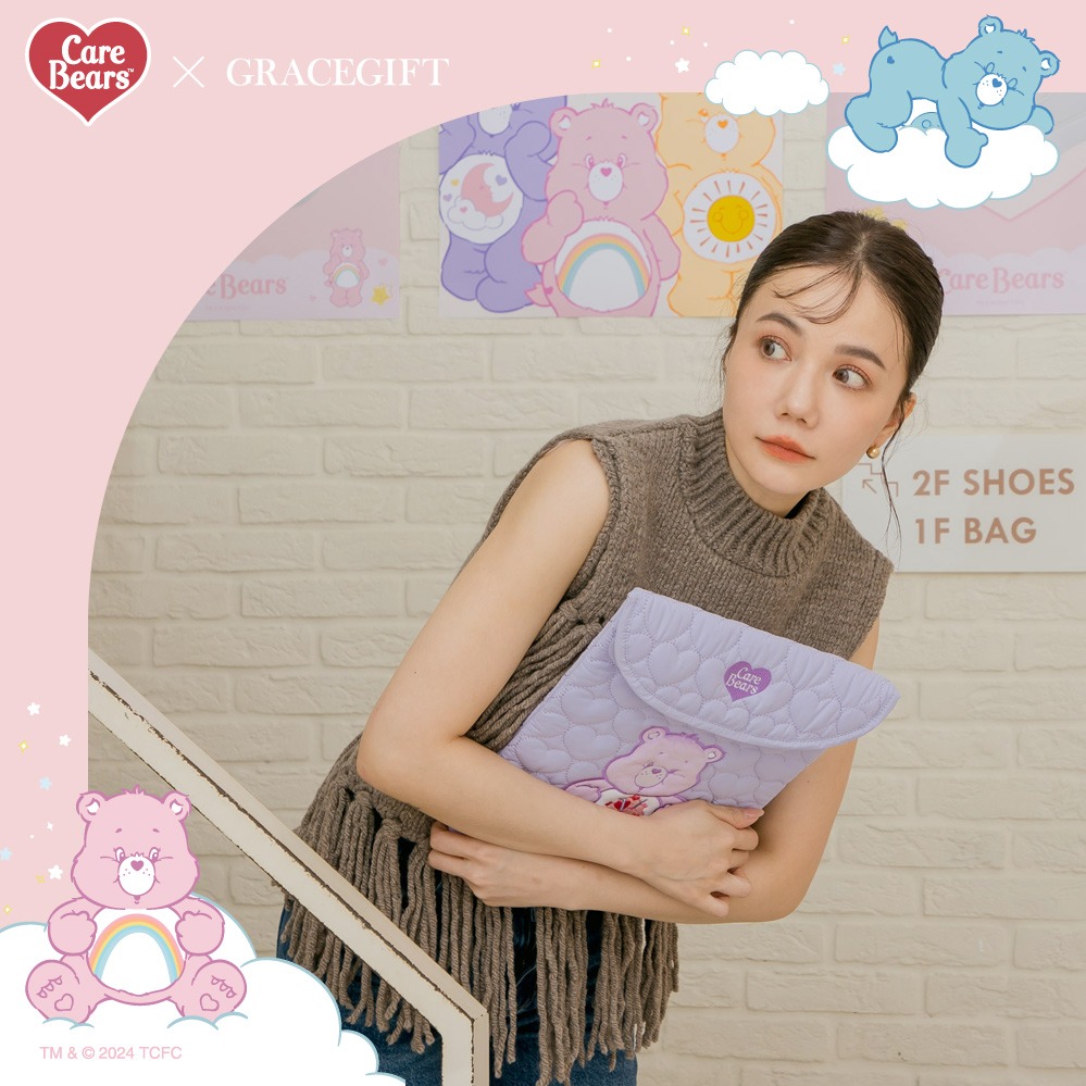 【Grace Gift】CareBears-彩虹熊珍珠愛心空氣電腦包|任選米白、淺金、銀|禮物推薦