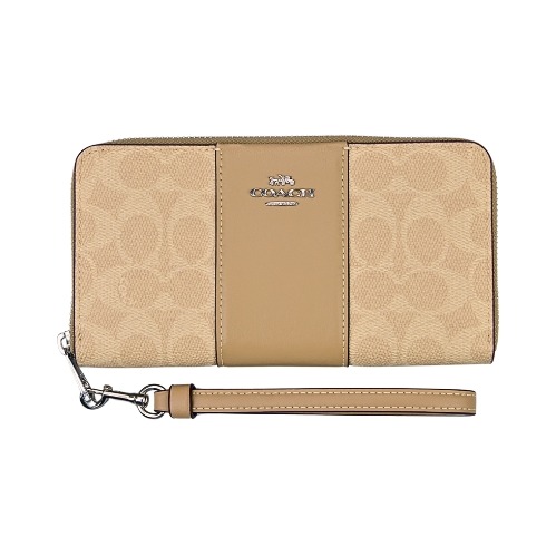 [平輸版] 【COACH】沙色C LOGO PVC附活動卡夾皮革手掛帶拉鍊長夾 真品平輸