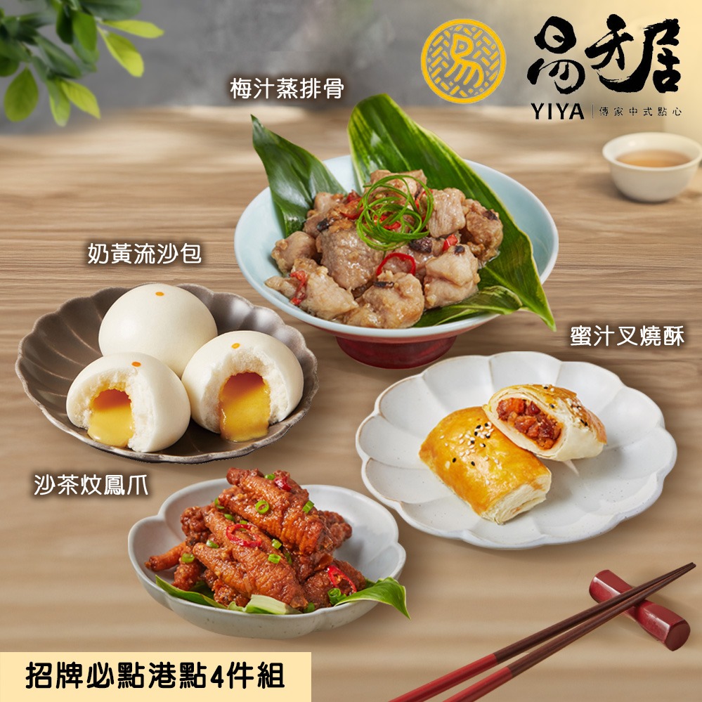 預購【易牙居】招牌港點4件組(奶黃流沙包/蜜汁叉燒酥/沙茶炆鳳爪/梅汁蒸排骨)過年 除夕 團圓 年菜 港點