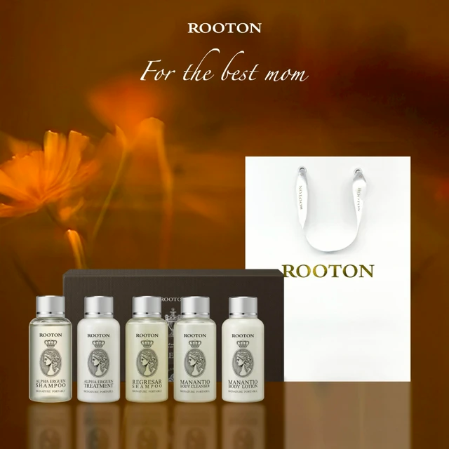 快速出貨【ROOTON】柔順秀髮!髮根噴霧150ml+植萃洗髮精70ml+頭皮按摩梳+海藻洗髮精10ml x2+護髮素10ml x2+沐浴膠5ml+身體乳5ml+燙金禮袋
