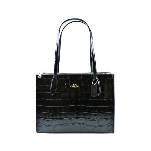 [平輸版] 【COACH】金銀紗緹花C LOGO拼接黑色素面皮革雙面名片/票卡夾 真品平輸