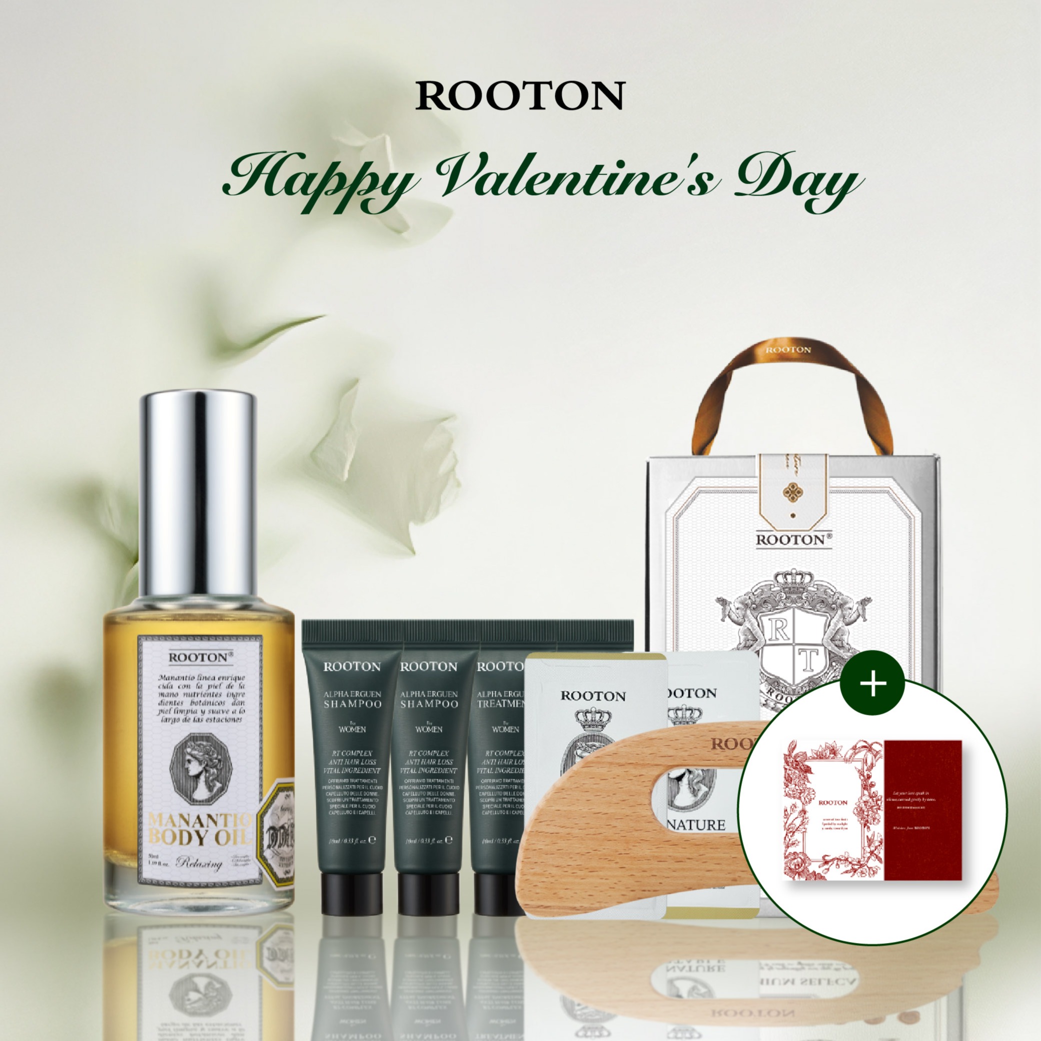 快速出貨【ROOTON】情人節快樂!髮根噴霧150ml+甦活植萃洗髮精200ml+沐浴膠5ml+身體乳5ml+甦活養髮梳+棉麻束口袋+情人節小卡+燙金禮袋