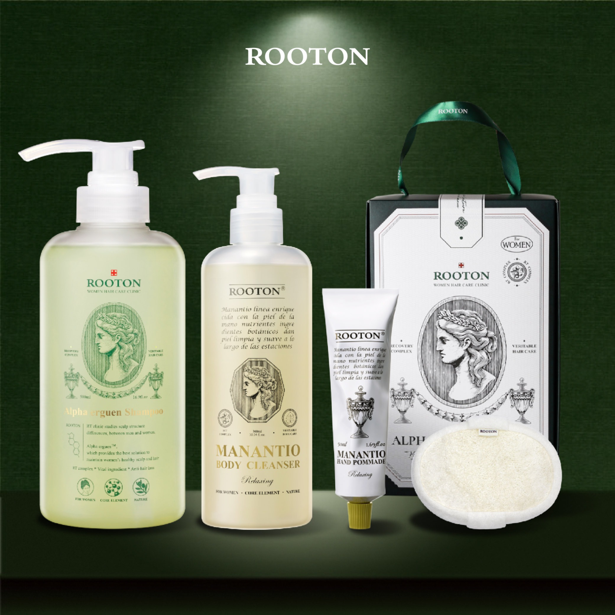 快速出貨【ROOTON】柔順秀髮!髮根噴霧150ml+植萃洗髮精70ml+海藻洗髮精10ml x2+護髮素10ml x2+沐浴膠5ml+身體乳5ml+燙金禮袋