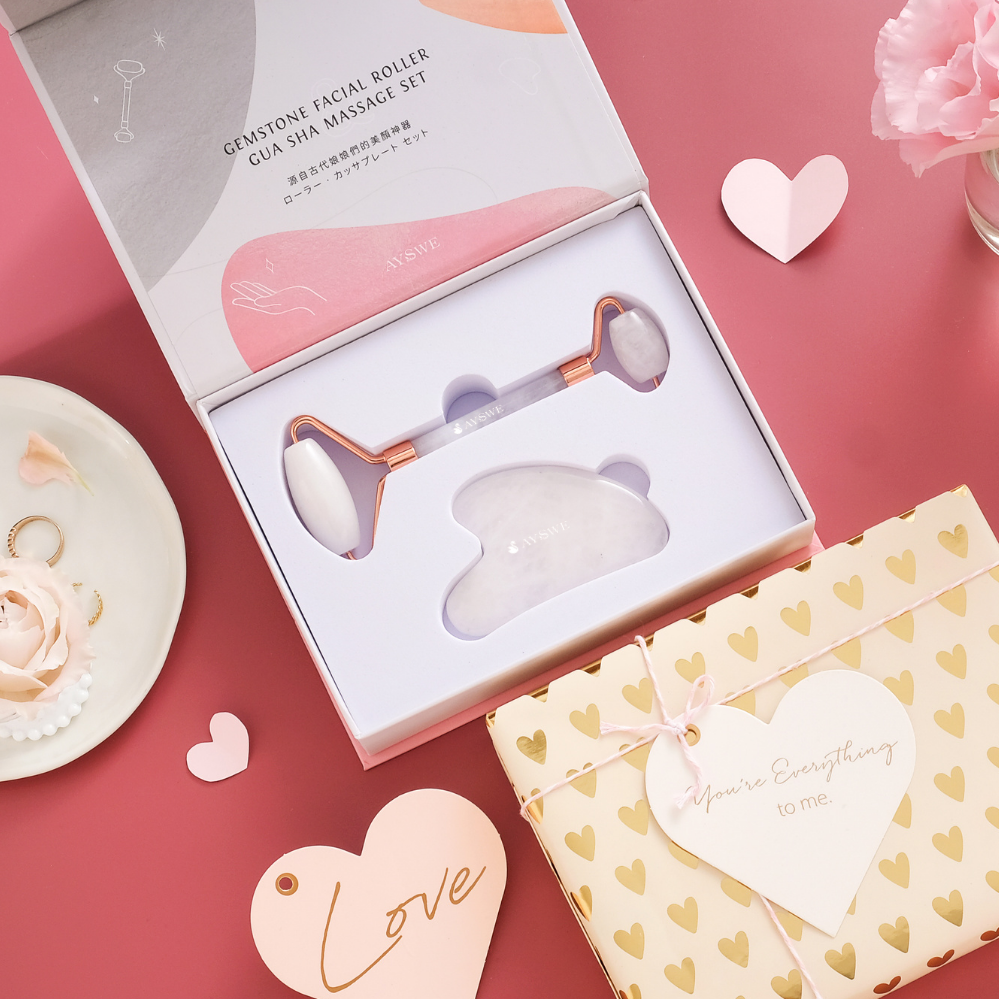 【愛蕊友肌】情人節快樂💕|粉晶滾輪美顏娘娘棒刮痧板禮盒組 + 角鯊透亮精萃油-臉部美容按摩