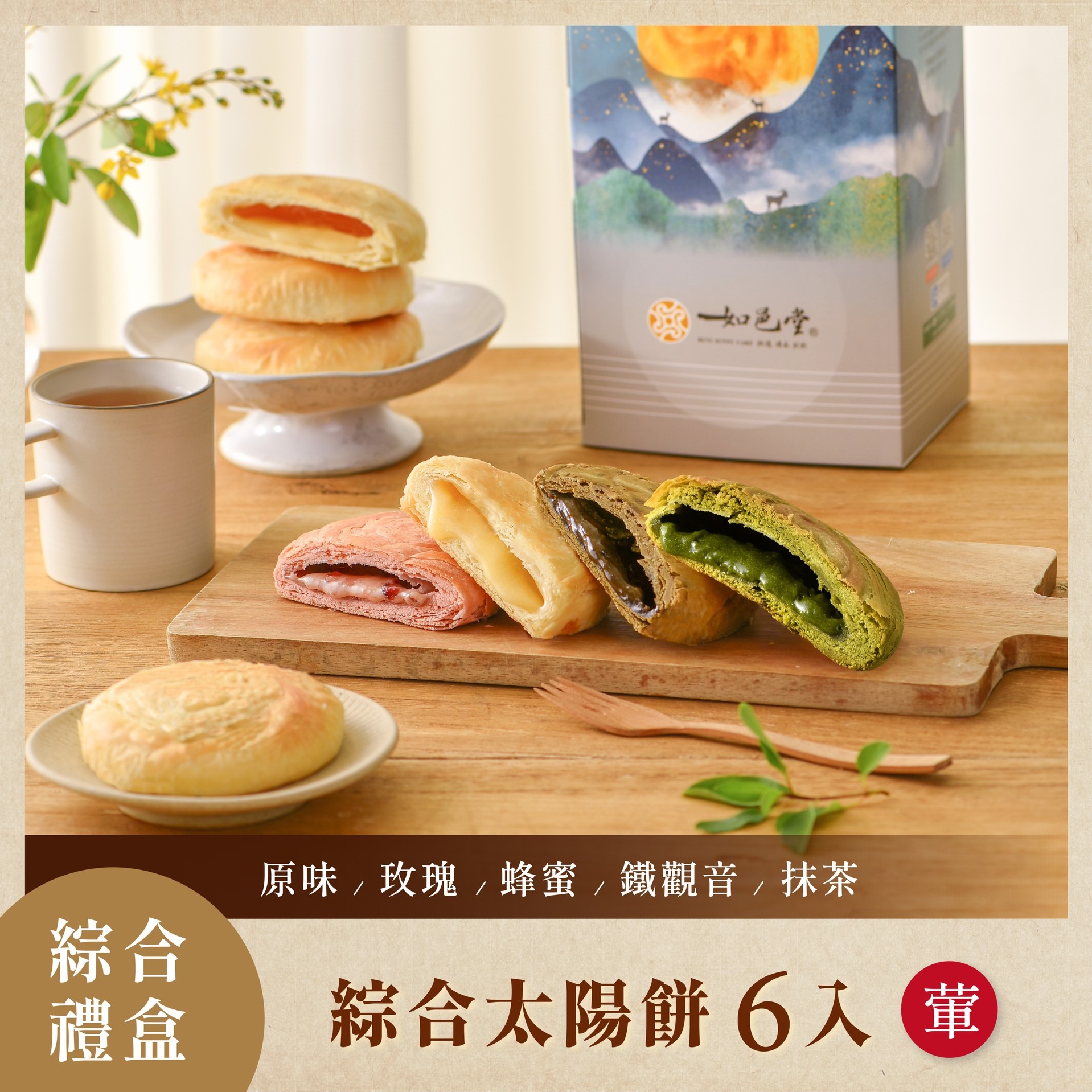 【如邑堂】新綜合太陽餅12入組(葷)|原味/蜂蜜/鹽之花/鐵觀音各3顆,一次滿足💖