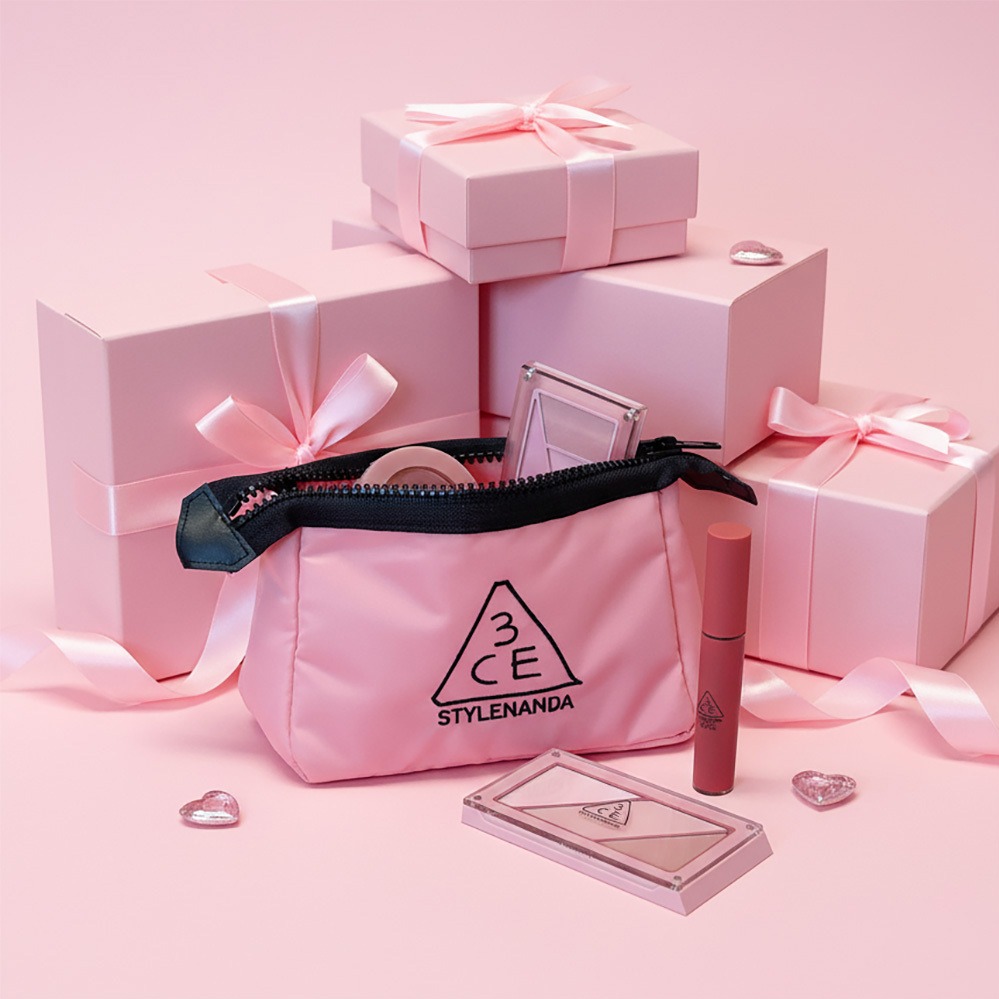 【3CE】單色腮紅+光澤蜜漾唇釉+玫瑰粉化妝包套禮