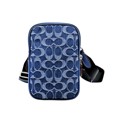 [平輸版] 【COACH】午夜藍C LOGO 拼接荔枝紋皮革帆布織帶手提/斜背小款立體方包 真品平輸