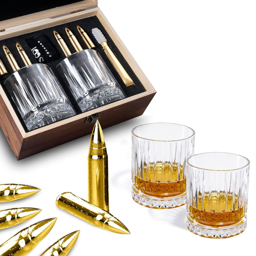 歡慶感恩節 | 威士忌4合一精緻質感木盒禮盒 (威士忌玻璃杯 2 件組 波本威士忌杯 |6顆花崗岩冰涼岩 |花崗岩收納盤 |夾子) 最佳喬遷之禮 交換禮物 最佳禮品 最佳飲酒禮品