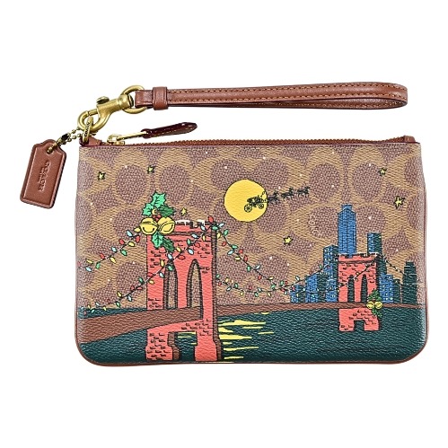 [平輸版] 【COACH】黑色豹紋印花杏黃色荔枝紋金屬馬車LOGO手掛零錢包 真品平輸