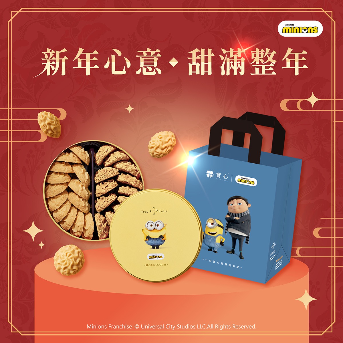 新年快樂♡快速出貨【實心蛋捲 |小小兵聯名】曲奇雙響提袋組–米色款 過年 新春送禮 馬年行大運