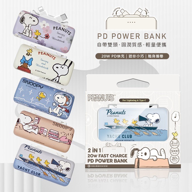 【Timo禮品館】SNOOPY史努比 Type-C + Lightning雙頭口袋充PD行動電源5000mAh