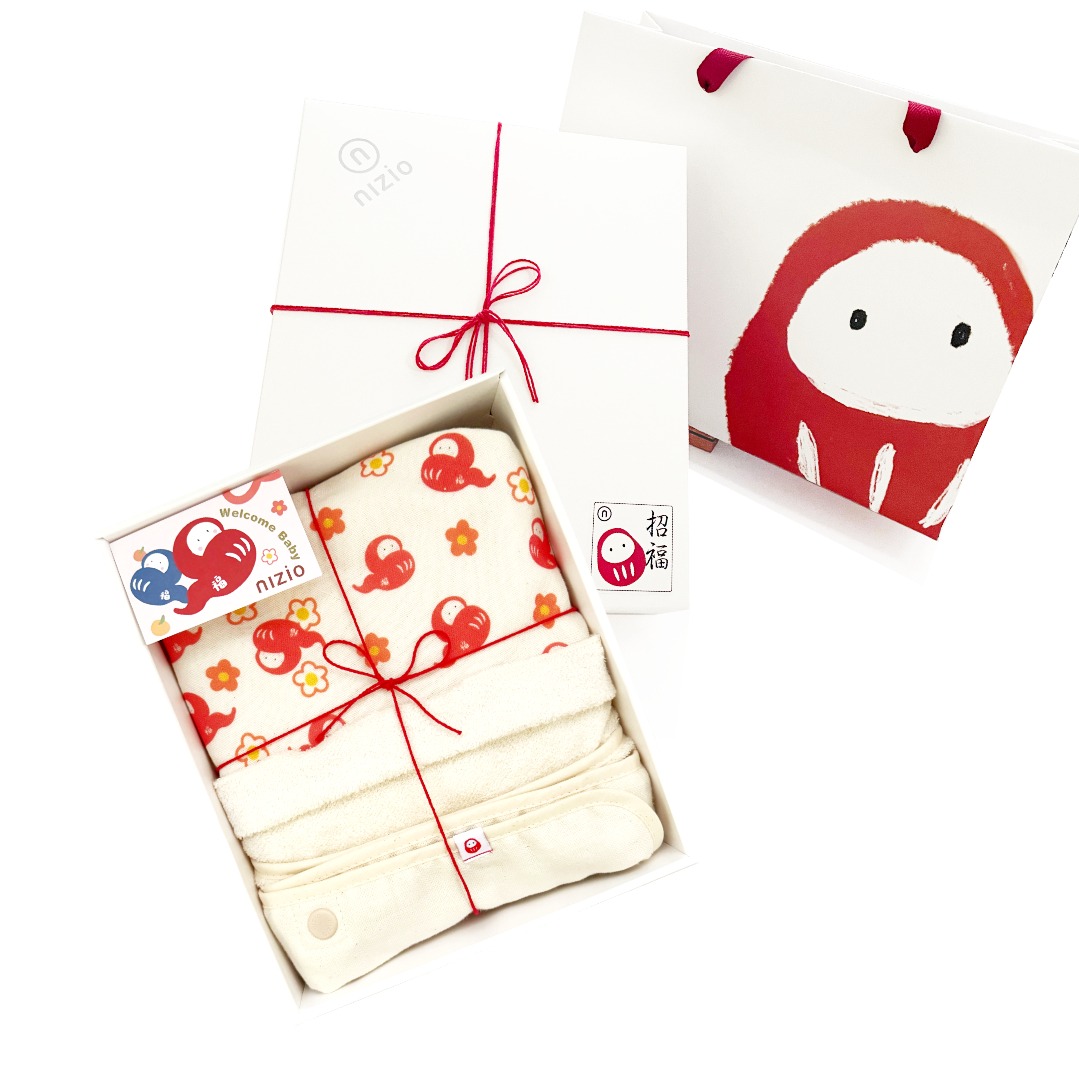 【nizio】招福帽兜斗篷浴巾彌月禮組 (附禮袋+禮盒搭配紅棉線)