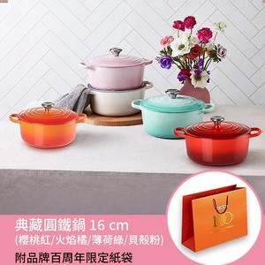 【收禮者可自選】Le Creuset-典藏琺瑯鑄鐵鍋圓鍋 16 cm(櫻桃紅/火焰橘/薄荷綠/貝殼粉-鋼頭-內鍋白 4色可選 )