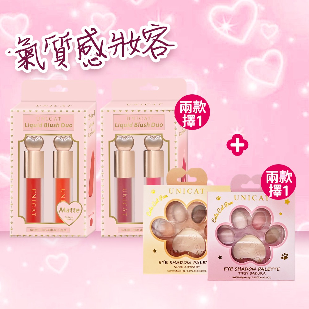 【UNICAT 變臉貓】禮物|愛心唇頰兩用唇泥 玫瑰奶霜/蜜桃橘 (附愛心唇泥 可當鑰匙圈使用)+控油保濕礦物蜜粉