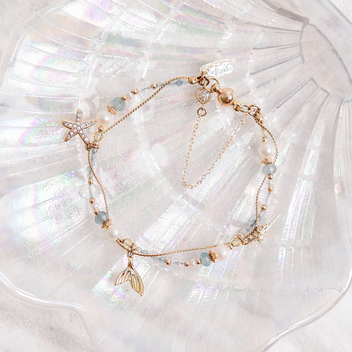 【Ficelle輕珠寶】世界盡頭的戀人| 海藍寶 珍珠 磷灰石 月光石 海藍玉髓 藍鋯石 蛋白石 白水晶 黃銅鍍18K金 雙層手鍊